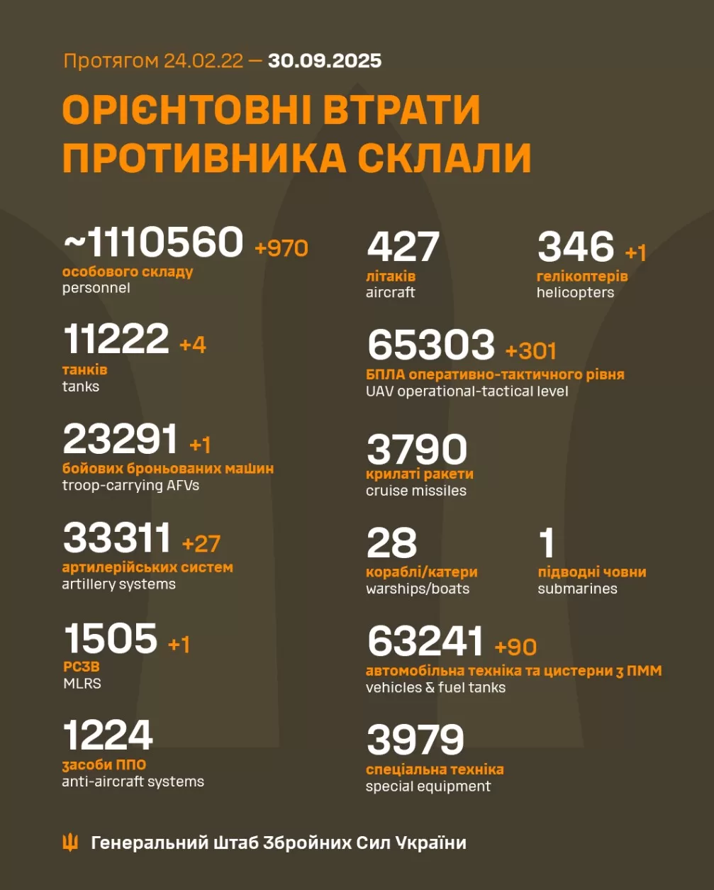 По состоянию на 30 сентября 2025 года общие боевые потери российских войск с начала полномасштабного вторжения составляют около 1 110 560 человек. Только за последние сутки ВСУ ликвидировали ещё 970 военнослужащих. Об этом сообщил Генеральный штаб ВСУ.