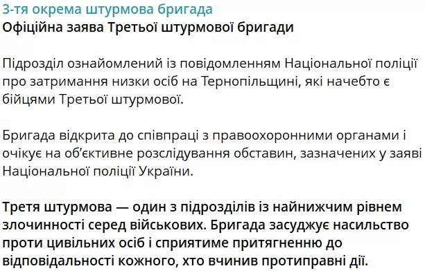 «Подразделение ознакомлено с сообщением Национальной полиции о задержании ряда лиц в Тернопольской области, которые якобы являются бойцами Третьей штурмовой», — говорится в сообщении.