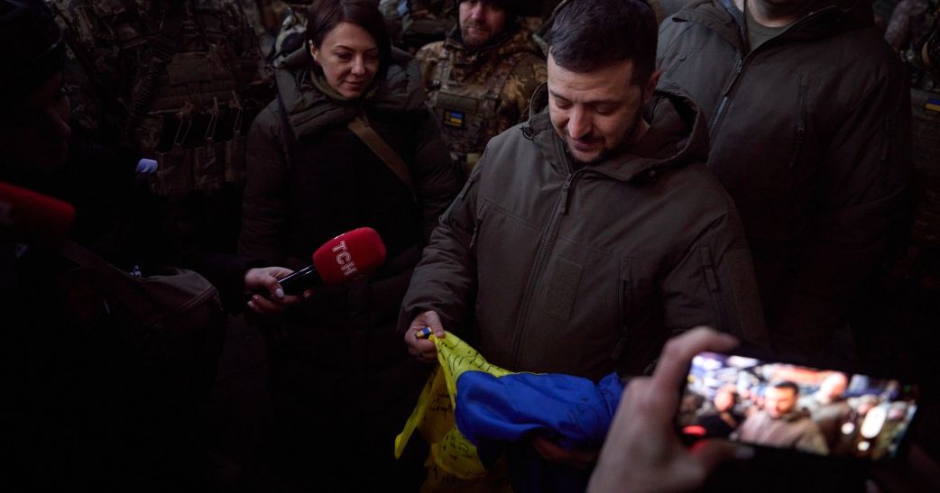 На видео видно, как неназванный военный передает флаг Зеленскому в городе Бахмут, говоря, что это подарок «нашим братьям в США. Мы просим вас передать им. Спасибо».