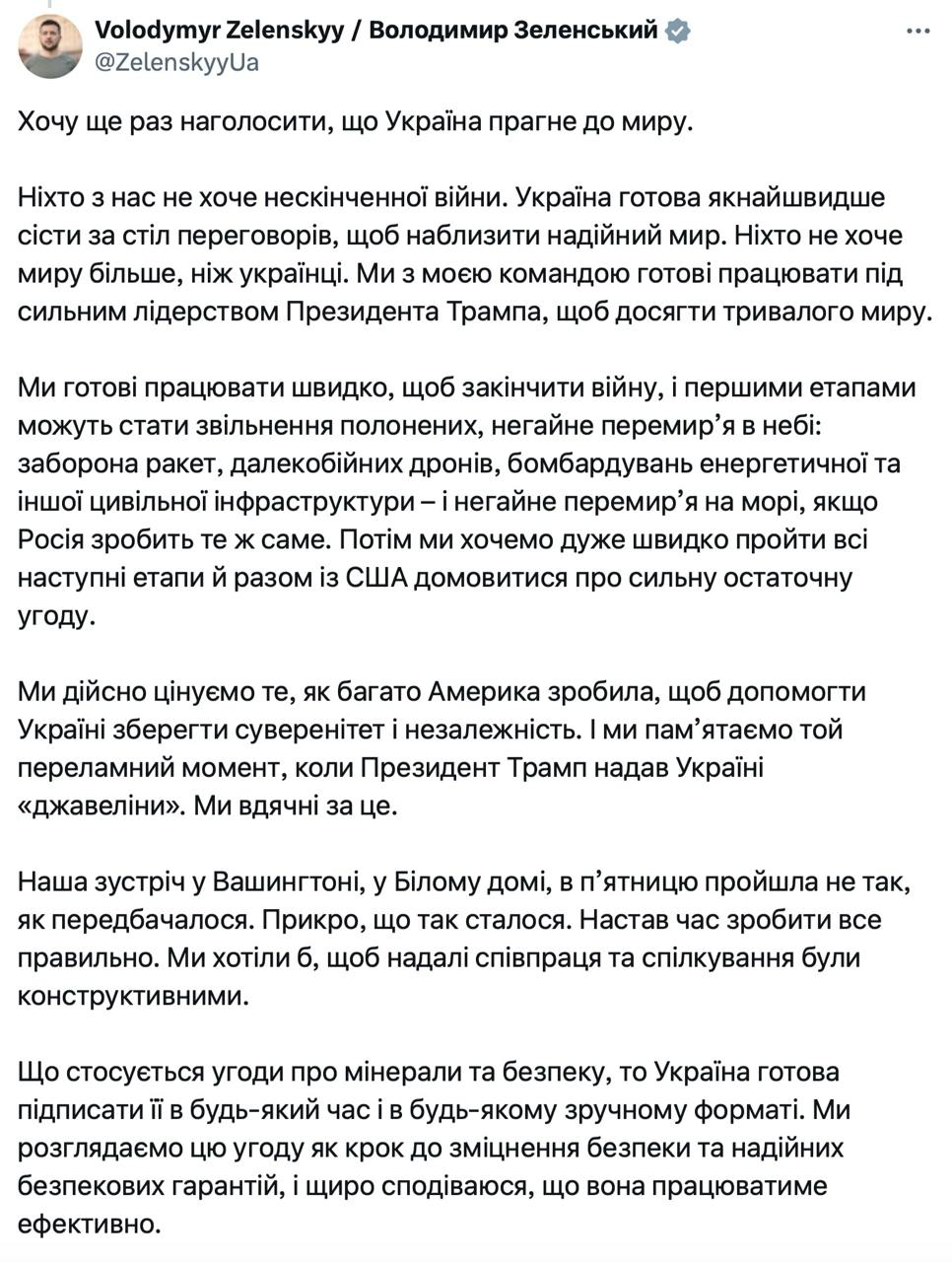 Сегодня на официальной странице Президента Украины Владимира Зеленского в сети X появился пост, в котором отмечается стремление Украины к миру, благодарность Трампу за «джавелины» и заверения в готовности как можно быстрее сесть за стол переговоров.